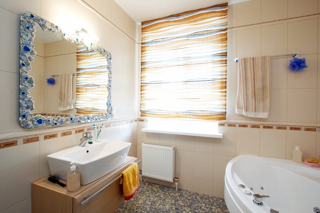 Bathrooms typically don’t give you much space to work with a lot of decorative accents. Take advantage of the windows in the room and add design elements by choosing a bold pattern or print in vibrant colors for your window treatments.